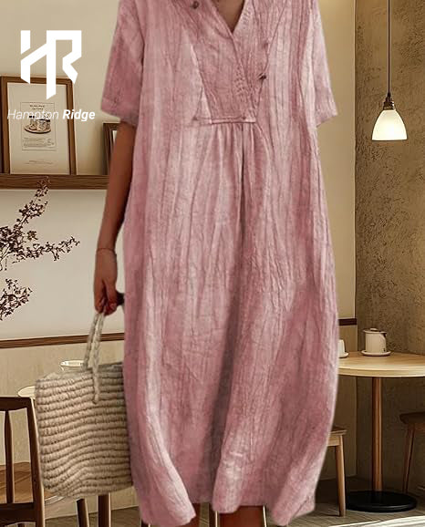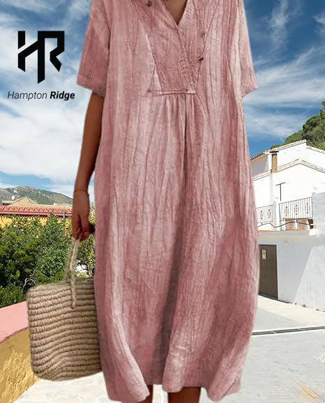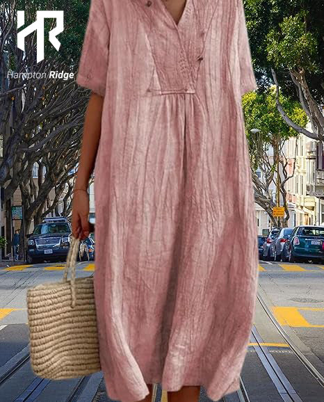 Hampton Ridge- Women's Cotton Linen Midi Dress Soft V-Neck 3/4 Sleeve Casual Dresses for Summer Beach Vacations Everyday Wear